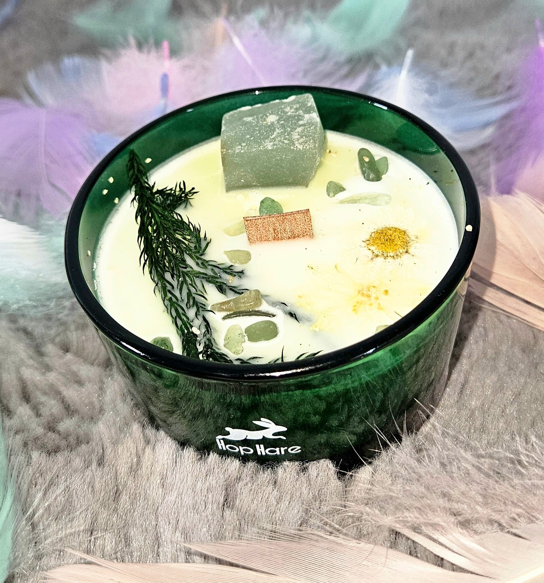 Composition : cire de soja, cristal de jade, fleurs séchées, parfum envoûtant de menthe
